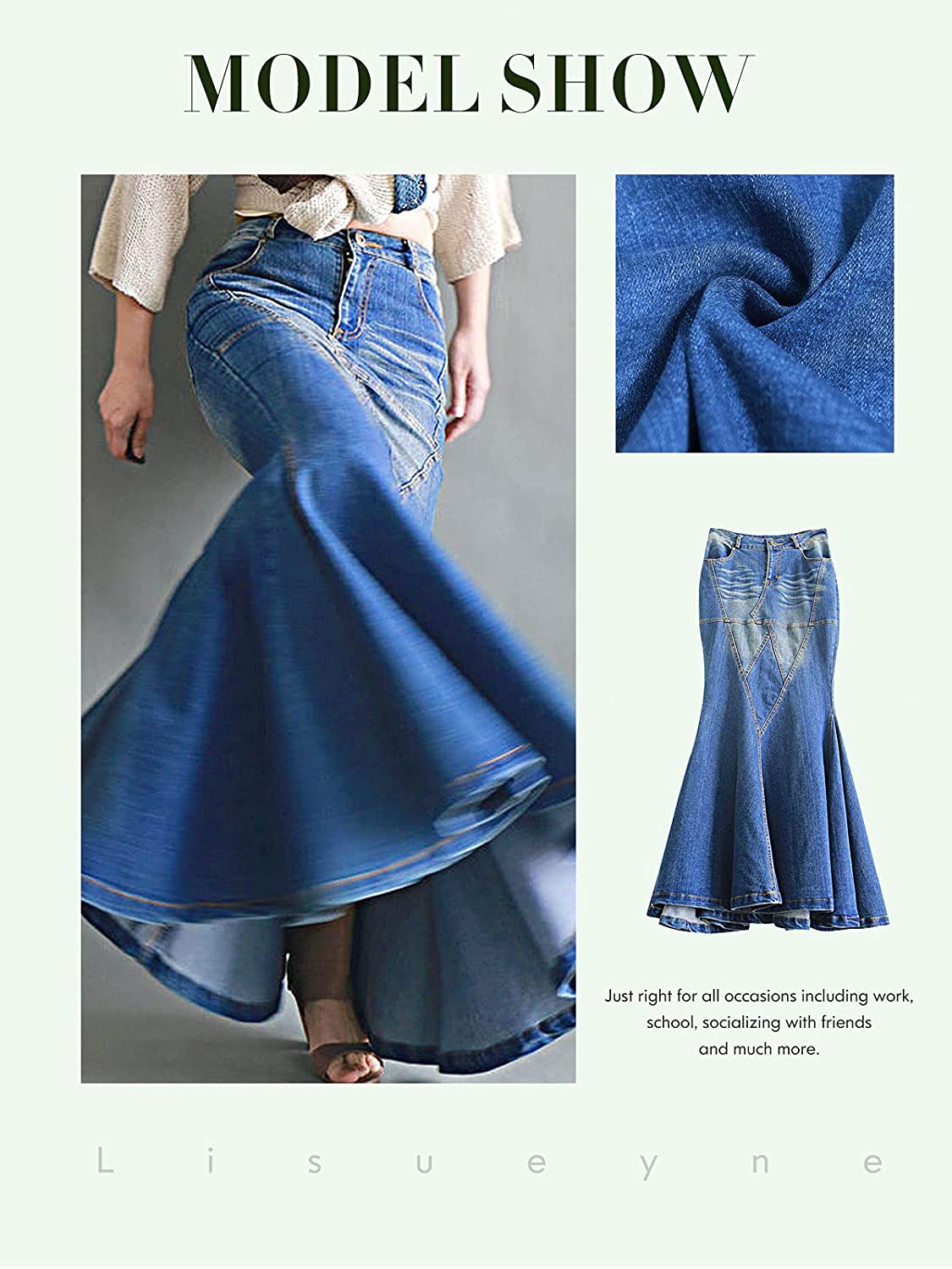 LISUEYNE Women's Casual Stretch Waist Washed Denim Ruffled Fishtail Skirt Long Denim Skirt