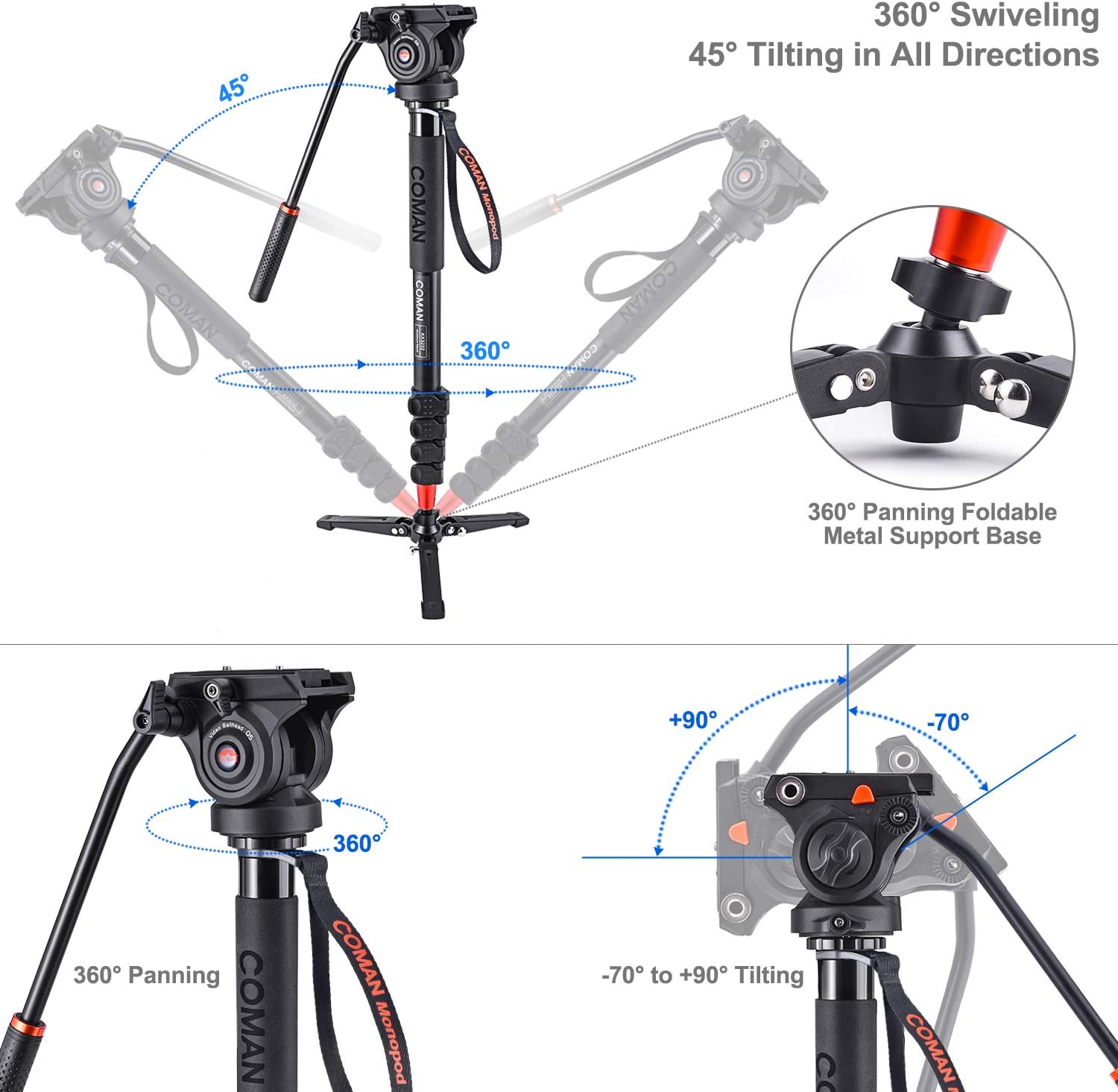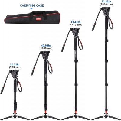 Monopod, COMAN KX3232 73.2 Inch Professional Monopod Tripod Lightweight Aluminum Telescopic Camera Monopod with Legs and Head Hydraulic Head for DSLR Cameras